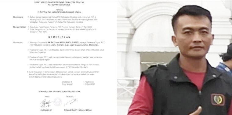 Berdasarkan pertimbangan dalam SK, keputusan tersebut merujuk pada hasil rapat harian pengurus PWI Sumsel yang digelar pada Senin, 27 April 2026, serta surat pengunduran diri dari ketua sebelumnya.