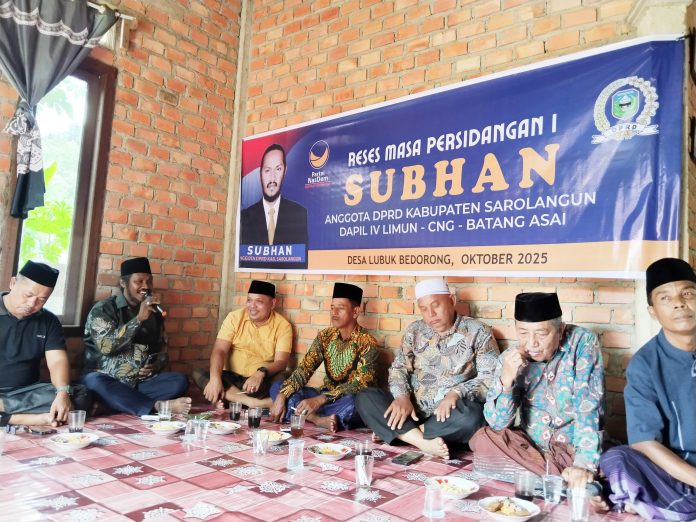 Sarolangun, Beritabicara.com – Anggota Dewan Perwakilan Rakyat Daerah (DPRD) Kabupaten Sarolangun, Provinsi Jambi, dari Partai Nasional Demokrat (NasDem), Subhan melaksanakan reses masa persidangan I di Desa Lubuk Bedorong, Kecamatan Limun daerah itu, Kamis (23/10/2025).