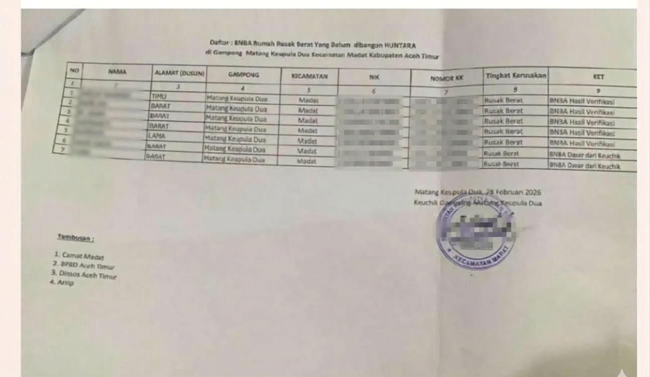 Data By Name By Address (BNBA) tertanggal 28 Februari 2026 yang ditandatangani oleh oknum Keuchik memicu kecurigaan besar. Pasalnya, beredar dugaan kuat di lapangan bahwa daftar penerima manfaat tersebut tidak tepat sasaran.