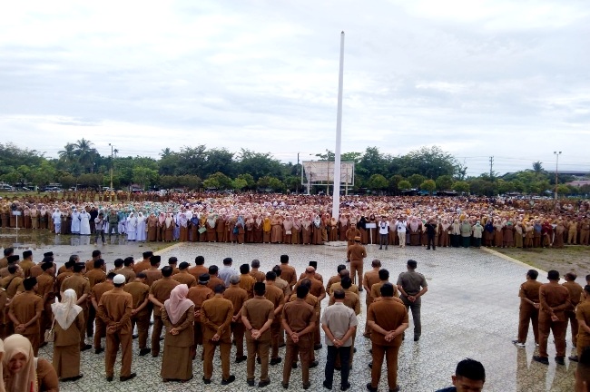 Aceh Timur, Beritabicara.com – Bupati Aceh Timur, Iskandar Usman Al-Farlaky mengumpulkan ribuan Aparatur Negara ASN (ASN) dan Pegawai Pemerintah dengan Perjanjian Kerja (PPPK) dilapangan Pusat Pemerintahan yang terletak di Gampong Titi Baro Kecamatan Idi, Aceh Timur, Senin, 24 Maret 2025.