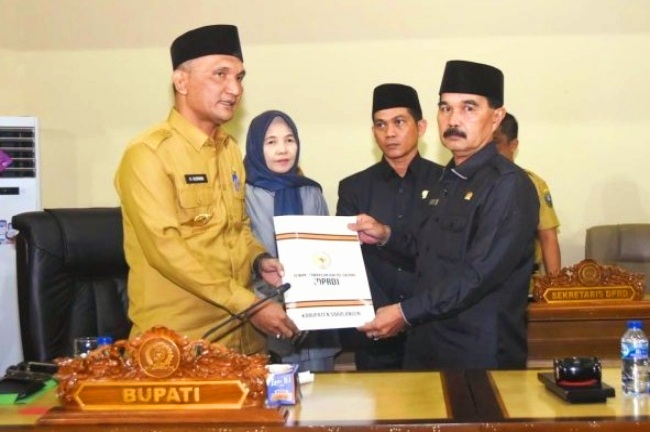 Usai pembacaan laporan Pansus DPRD Sarolangun yang disampaikan Hj Fatimah, Ketua DPRD Sarolangun Ahmad Jani menyerahkan rekomendasi DPRD terhadap LKPJ Bupati Sarolangun tahun 2024 kepada Bupati Sarolangun Hurmin.