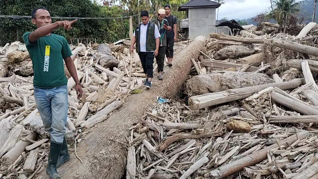 Warga berjalan di atas tumpukan material kayu yang dibawa banjir bandang yang menenggelamkan pemukiman penduduk Gampong Umah Sunti, Kecamatan Serba Jadi, Aceh Timur. Foto direkam, Kamis (1/1/2026). Foto : DOK ALIANSI PERS KAWAL REHAB REKON PASCA BENCANA ACEH.