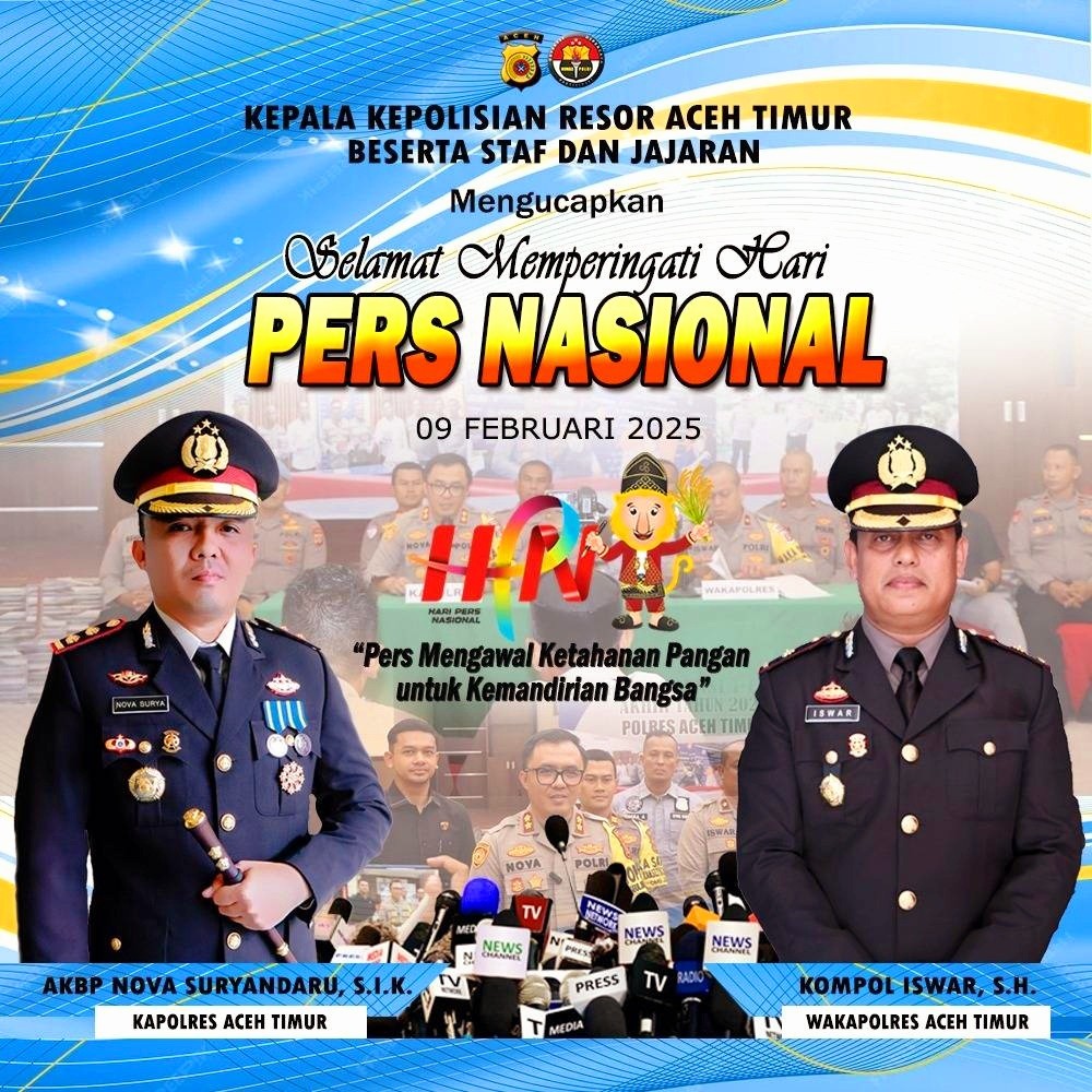 Aceh Timur, Beritabicara.com – Kapolres Aceh Timur, Polda Aceh AKBP Nova Suryandaru, S.I.K. mengucapkan Selamat Hari Pers Nasional 2025 untuk seluruh insan pers khususnya yang bertugas di Kabupaten Aceh Timur.