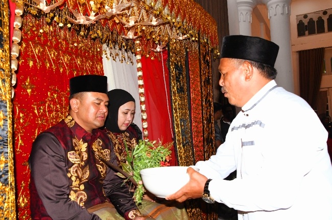 Penyambutan diawali peusijuk Kapolres Aceh Timur dan Ketua Bhayangkari Cabang Aceh Timur, Ny. Zilka Irwan Kurniadi oleh Ketua MPU Aceh Timur Tgk. H. Muhammad Thahir.