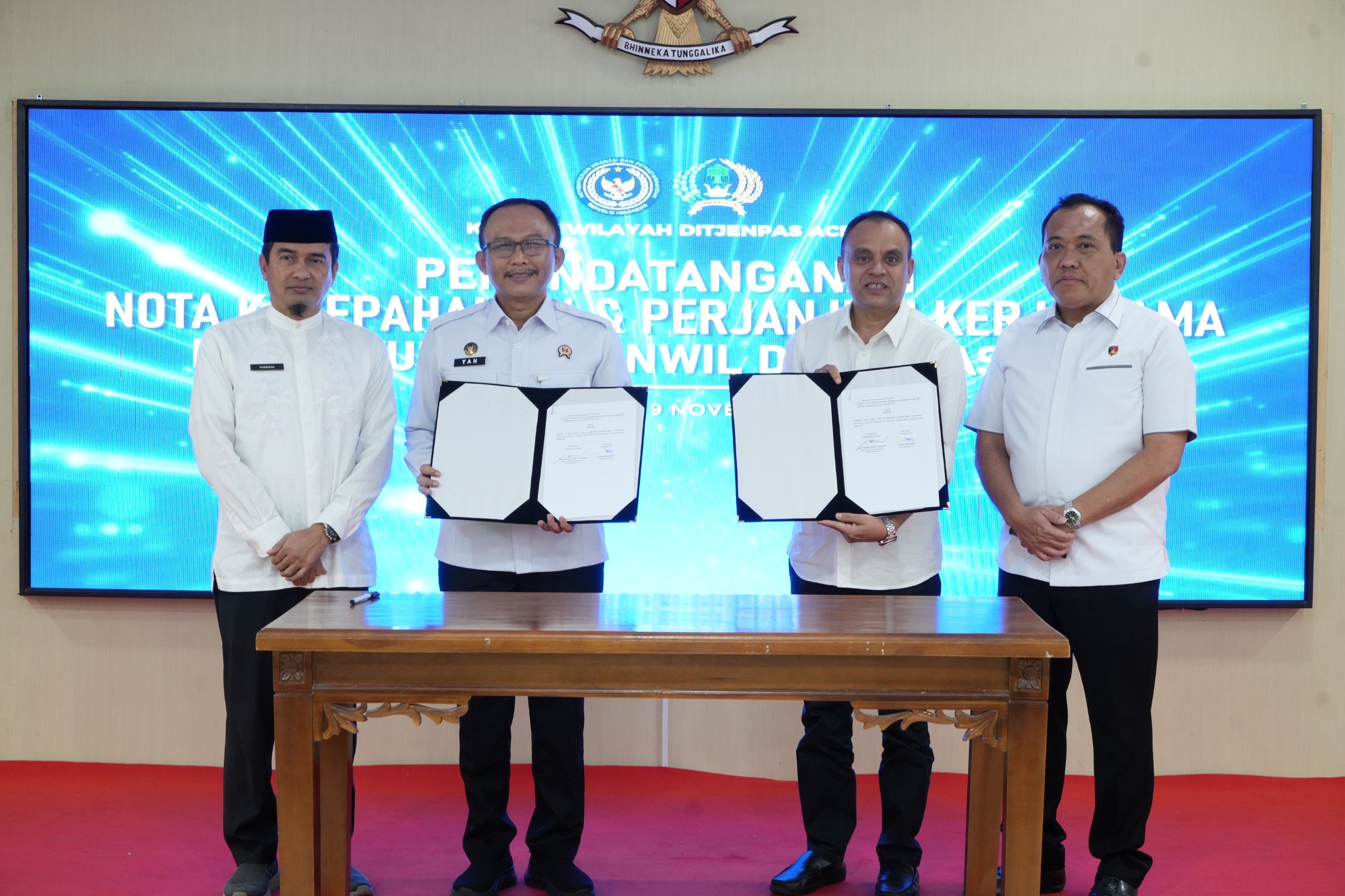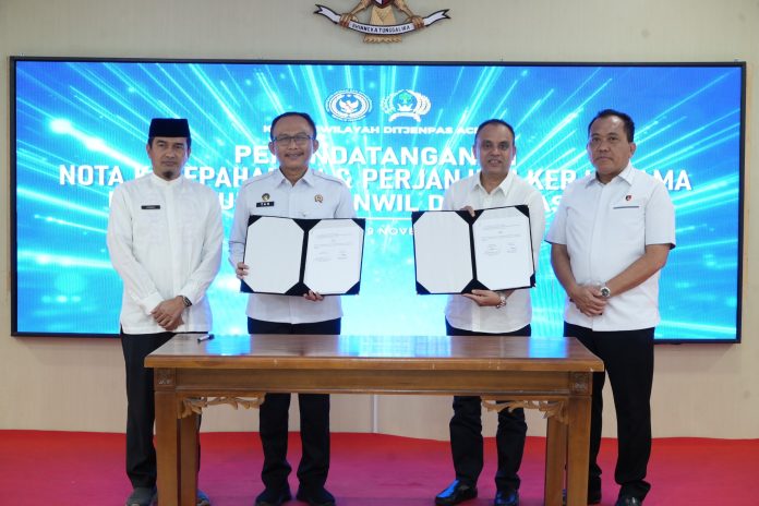 Momentum Hari Bakti pertama ini turut dirangkaikan dengan penandatanganan dua Nota Kesepahaman (MoU), yaitu antara Kanwil Ditjenpas Aceh dengan Dinas Kesehatan Aceh serta dengan Badan Narkotika Nasional Provinsi Aceh. Kedua MoU tersebut menjadi langkah penting dalam peningkatan layanan kesehatan warga binaan dan penguatan upaya pencegahan serta penanggulangan narkotika di lingkungan Pemasyarakatan Aceh.