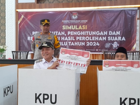 Simulasi ini pertama kali langsung diberikan KPU kepada Penjabat (Pj) Bupati Sarolangun, Bachril Bakri untuk uji coba cara pencoblosan surat suara.