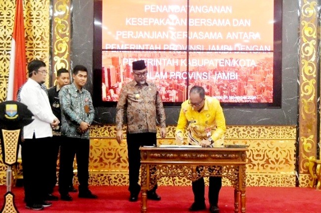 Jambi, Beritabicara.com – Penjabat (Pj) Bupati Sarolangun Dr Bahri, S. STP, M.Si melakukan penandatangan Memorandum Of Understanding (MoU) dengan Penjabat Sementara (PJs) Gubernur Jambi H Sudirman, SH, MH, Jumat (01/11/2024) di Aula Kantor Gubernur Jambi.