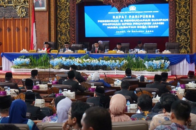 Dalam Rangka Pengucapan Sumpah/Janji Pimpinan DPRD Provinsi Jambi Masa Jabatan 2024-2029 bertampat di ruang Rapat Paripurna Gedung DPRD Provinsi Jambi, Sabtu (19/10/1024).