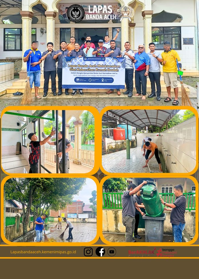 BANDA ACEH, Beritabicara.com-Menjelang datangnya Bulan Suci Ramadhan 1447H, Lapas Kelas IIA Banda Aceh menggelar kegiatan kurve gotong royong di area tempat Ibadah disekitar Lapas, yakni Meunasah Bineh Blang. Selasa (17/02/2026).
