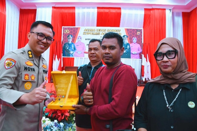 Aceh Timur, Beritabicara.com – Jalin kemitraan selama bertugas, Jurnalis Aceh Timur memberikan kenangan berupa plakat sahabat Pers kepada kapolres Aceh Timur AKBP Nova Suryandaru. S.I.K,di aula polres setempat, Jumat (18/4/2025).